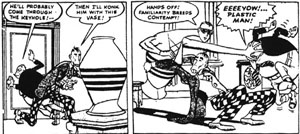 Jack Cole's inventive, exuberant style was of its time. Take the wry, tough, cockiness of a Warner Brothers gangster picture, then sidle across the lot to Termite Terrace and mix in the anarchic chaos of a Bob Clampett or Tex Avery and you might have something near the career of Jack Cole. He was one of the few men equally comfortable with serious and humorous drawing, and among the only to successfully combine the two. The result was a wild ride with Plastic Man, a series patently deserving of a high quality reprint library. Alas, something went terribly wrong, as Cole committed suicide at his apogee of achievement, the sale of a daily syndicated comic strip. To this day the reasons remain a mystery.