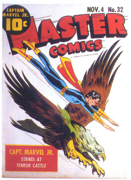 This masterpiece (no pun intended!), was created during a 14-month period during which Raboy produced no less than four of comics' all-time greatest covers for this series alone. Master Comics #27 (see commentary elsewhere in this list), #30 and #40 are likewise brilliant images, but this one may be the sharpest of all, with the perfectly drawn and lit figure of Captain Marvel Jr. streaking alongside an unforgettable depiction of our national symbol, the American Eagle. Released smack-dab in the midst of World War II (November, 1942), it was a powerful iconic message--America (and her sons) were not to be trifled with! One can only imagine a young boy standing in front of his local newsstand in Kansas or Tennesee, eyes wide, mouth agape, wondering just what was beyond the border of that cover and who was going to pay for arousing the ire of America and Captain Marvel Junior.
